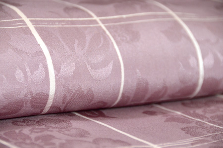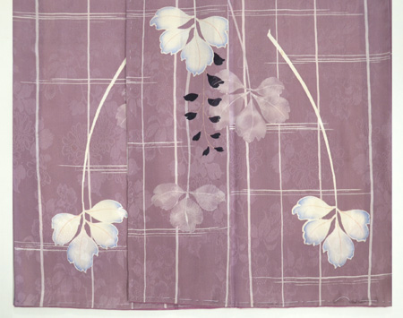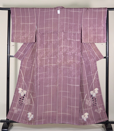 葡萄染めが、秋のしっとりとした空気を身に纏うようなお散歩着。 春と秋の花々が一面にちりばめ地紋織りされた上に、摺りガラス色の変わり格子が染められたやさしくモダンな一枚です。