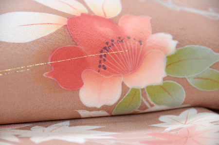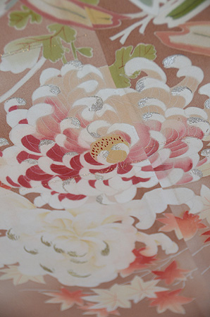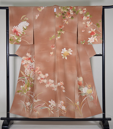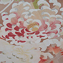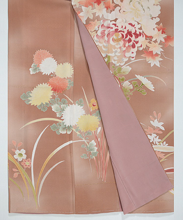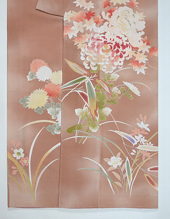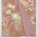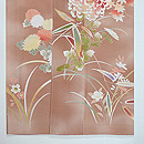 まさしく秋が満開で、それでいて、ゆるく上品で優しい訪問着です。 構図と色が、よくよく思案された事なのでしょう。 はんなりと、同時代の丸帯で決めたいですね。 地紋は疋田の霞紋です。