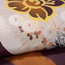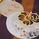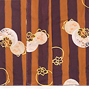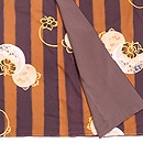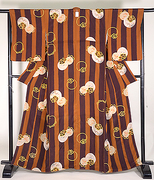 刷毛でさっと引いたような茶と焦茶の縞に、柿がぽんぽんと飛ぶユニークな小紋。 柿の実には秋の景色が描かれて、普通の柿の模様とはちょっと違う趣が楽しいきものです。