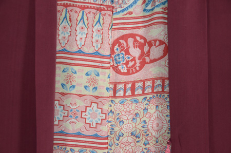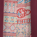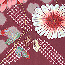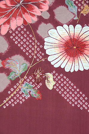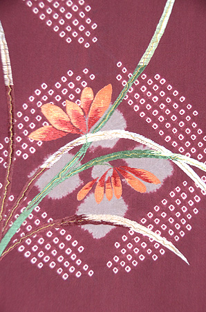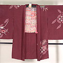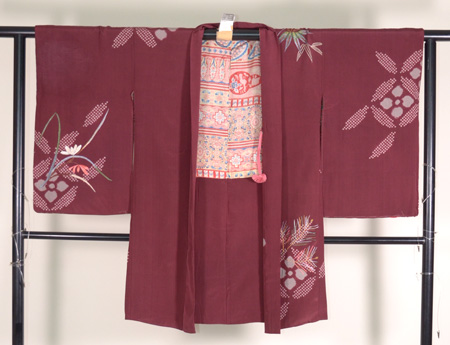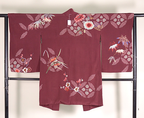 春蘭、竹、菊、梅に若松と四季の花々が、大きくゆったりと多色で刺繍された金紗の袷羽織。 ボルドー色の深い赤と愛らしい羽裏の更紗模様が、華やかな羽織です。