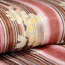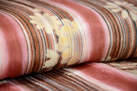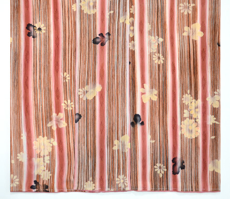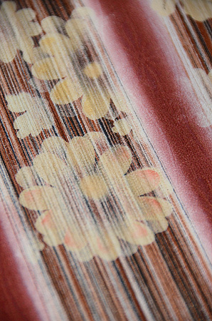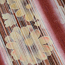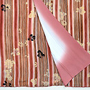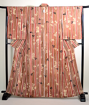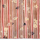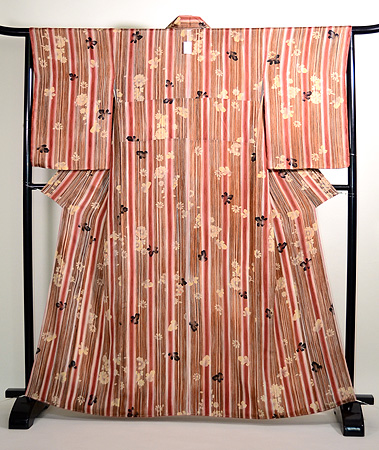 縞の具合と、散らされた菊のバランスがとても美しい小紋です。 信じられないことに、縦の縞はどう見ても手描きのようなのです。 それで、多くはない色使いで、複雑な柔らかい縞が生まれています。 丈はありますが、裄があまりないのが残念です。