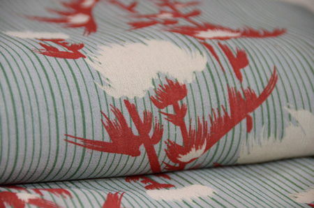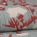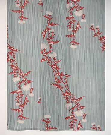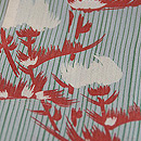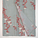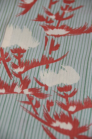 棒縞の中に、白いアザミが浮かんでいます。 グリーンの縞にエンジ色のコントラストが、清々しく涼しげなお着物です。 伊敷あてを付けて、お仕立て直しをしました。