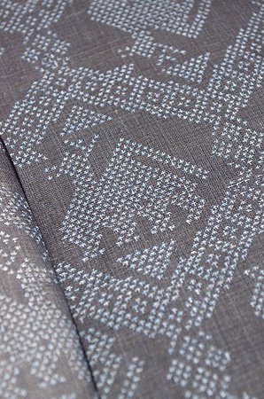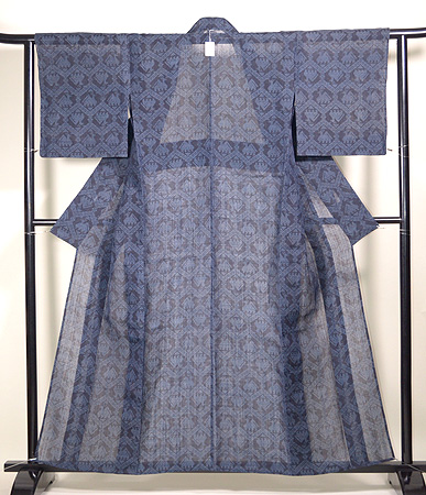 深い藍色にすっきりと有栖川紋絣。 裄は、1尺8寸(約68.4cm)まで大きくできますので、颯爽と着こなしていただきたい着物です。