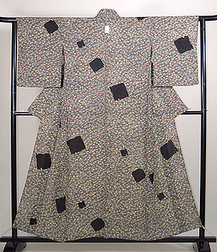 なんとも個性溢れるお着物です。 網手にもたれて、小菊が目一杯咲き誇り、色紙文様はよこ糸に金糸がはしる縫取りになっています。 どなたかに、着こしめして頂きたいものです。