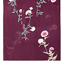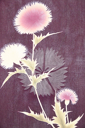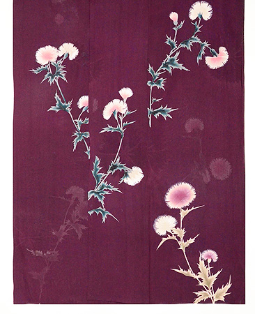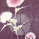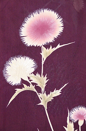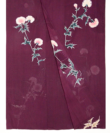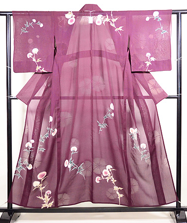 ジョーゼットの薄い反物にアザミの花が丁寧に描かれています。 無線友禅なので、お花の可憐さがきわだって、やさしい表情になっています。 大きな撫子の地紋が透けて、ひときわ美しく映えてみえます。 身丈、袖丈、裄共におおきくなります。