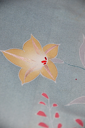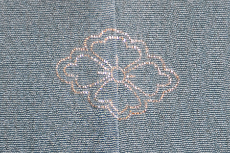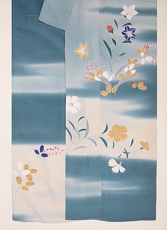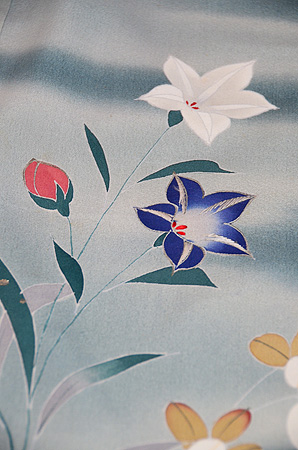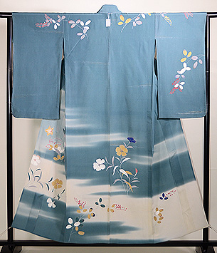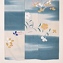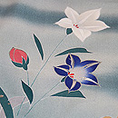 明るく爽やかな霞の中に秋の山野草が伸びやかに描かれています。 金銀通しの緯糸が華を添えて、たおやかな訪問着です。