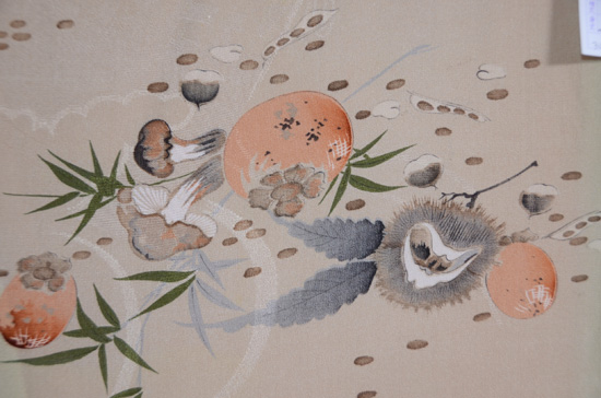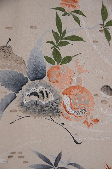刷込み小紋でしょうが、絵筆を使ったように美しく、秋の味覚を彷彿とさせる羽織です。 実りのものがいくつあるのか数えながら、あなたの後をつけて来る人が現れるかもしれませんね。 襦袢にはありがちなデザインですが、結局羽織という所に行き着きました。 裄はこれでいっぱいです。
