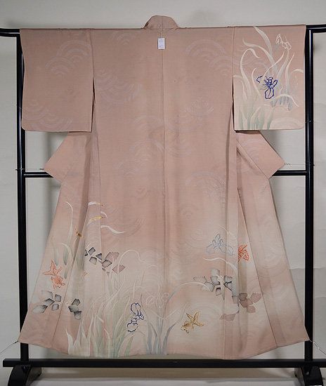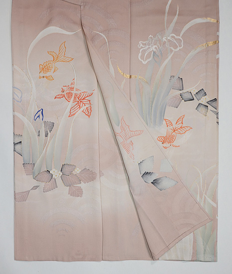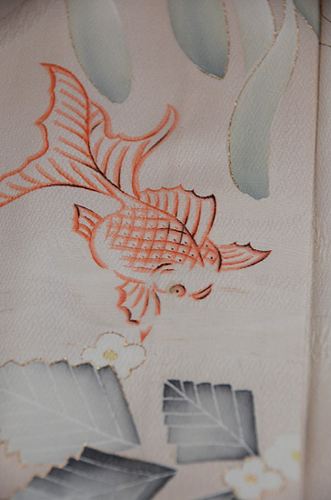 池の周りに菖蒲やアジサイが咲いて、季節は初夏を迎えています。 水ぬるみ、金魚たちも動きが活発になってきました。 全体に少しデコっぽい趣がありますが、地紋の大きな青海波が、格調を高めています。 桐の染め一つ紋があります。