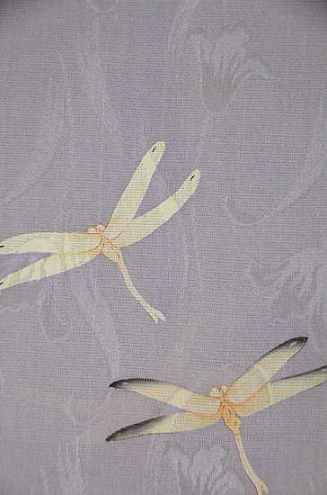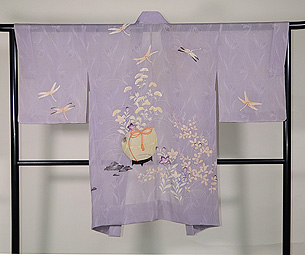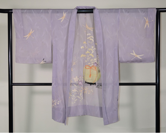 虫かごに鈴虫が止まり、トンボが飛び交う、爽やかで涼しげなお羽織です。 命あるものを見つけると動きが出てほっとします。 絽錦紗にはヌーボー模様のチューリップがエレガントです。