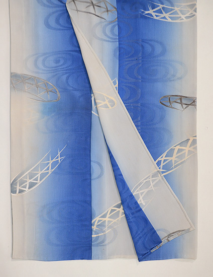 錦紗に観世水の大きな紋が透かしで入り、蛇籠だけが流れの中に置かれている、というのは、何かを待っている?ですよね。 池田さんのコレクションに入れても良いくらいのすばらしい意匠だと思われます。 鵜とか鮎の刺繍帯を置きたいです。