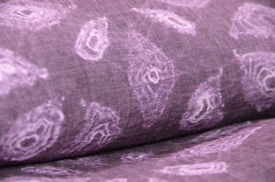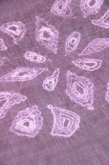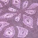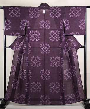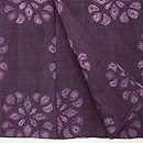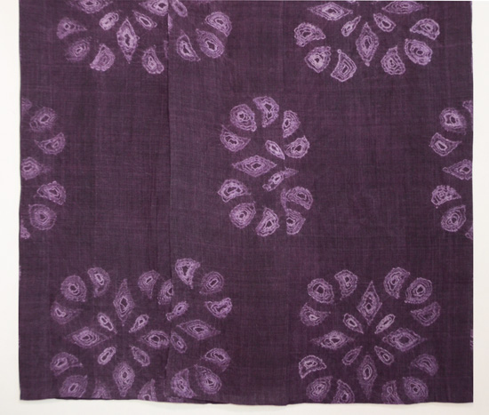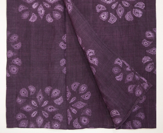 お花の柄を絞りで表現したのでしょうが、とても素朴な糸括りが微笑ましくなるような作品です。 麻を何回染めればこのような深い紫がでるのでしょうか。 時間と共に紫根の色は深く落ち着いていくようです。 お仕立て直しでこれほど大きなサイズになったのも希少なお値打ちです。