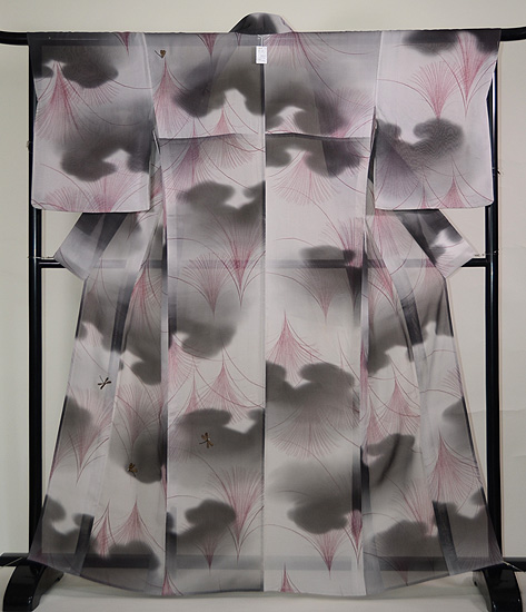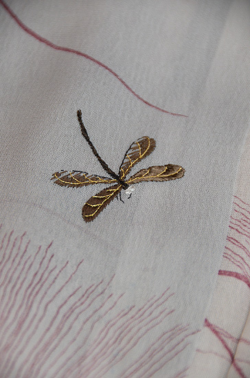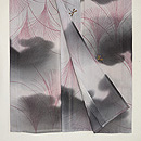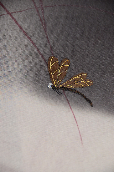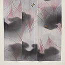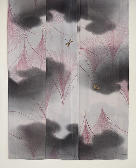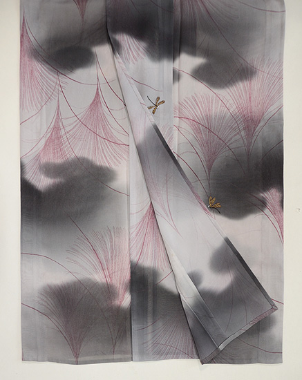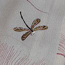 モノトーンの濃淡が美しい小紋に、オリジナルで蜻蛉の刺繍を入れ付下風にしました。 すすきの世界で遊ぶ蜻蛉たちが、静かな世界に微かな波紋を投げかけています。 寸法も大きく貴重です。