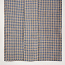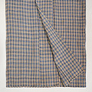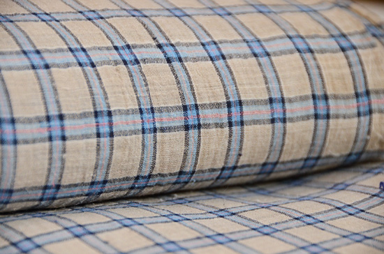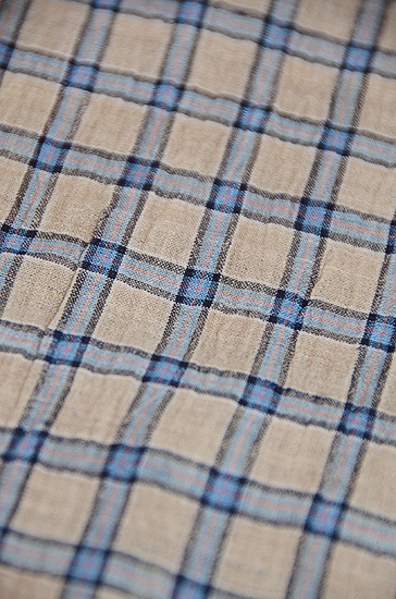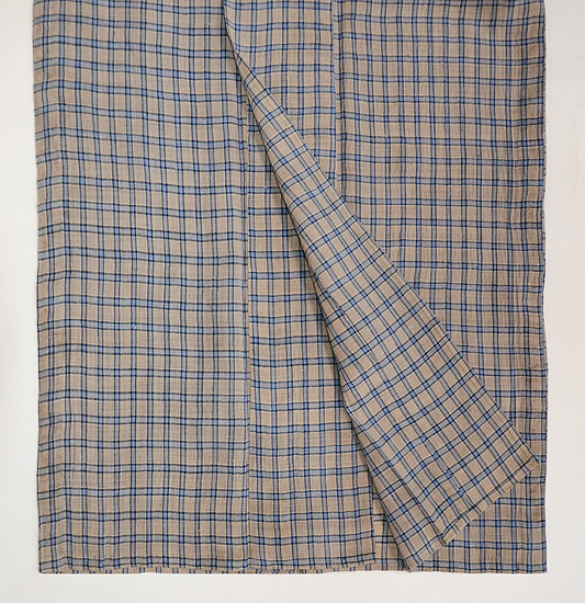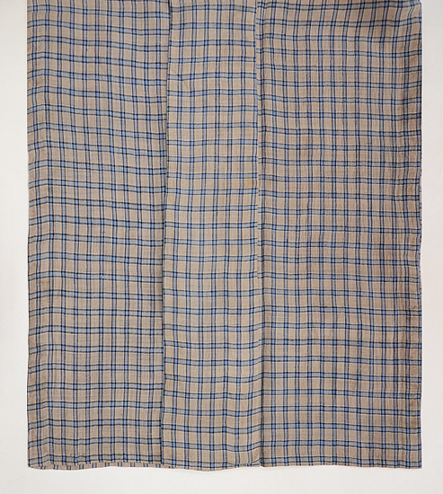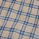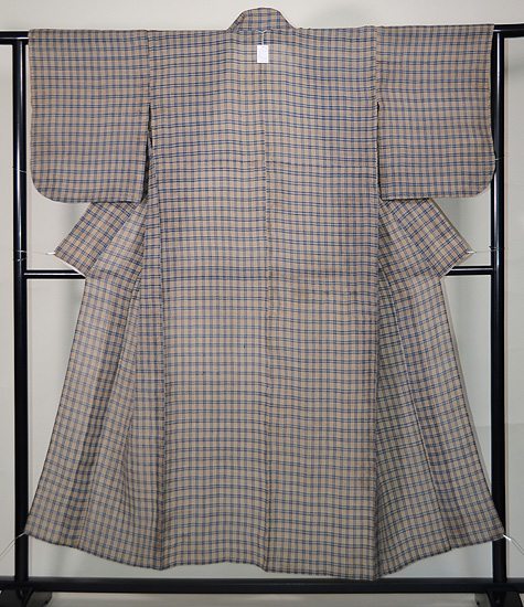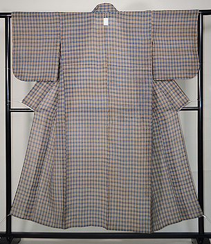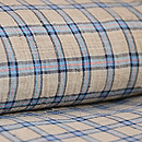 利休茶色と言いましょうか、グレーとベージュが混ざり合ったグレージュ色の地に、錆浅黄色(さびあさぎいろ)の格子文様がお洒落な越後上布です。
