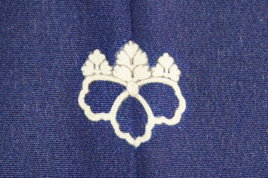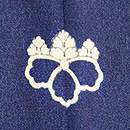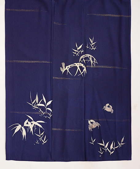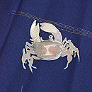静かな沢のほとりに、蟹のカップルのお散歩です。 わずかな刺繍が、よく効いています。 横に銀糸の織り込みが、川の流れとも、たなびく霞ともとれます。 五三の桐の一つ紋があります。