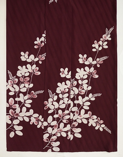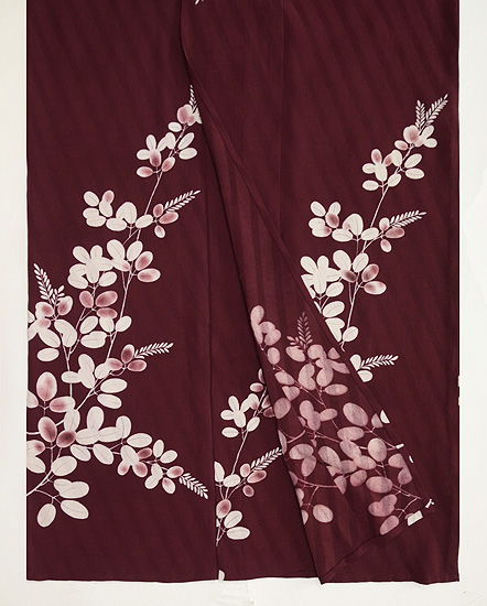 大きな萩の枝で覆われた、個性的な単衣着物です。 柔らかな錦紗地のなかに、代わり織で、これも大きな斜めの線が入って、奥行きを出しています。 晩秋の装いにピッタリです。