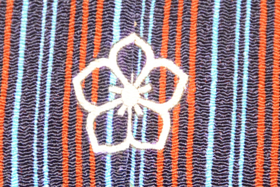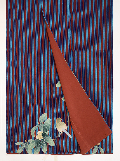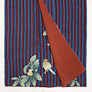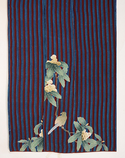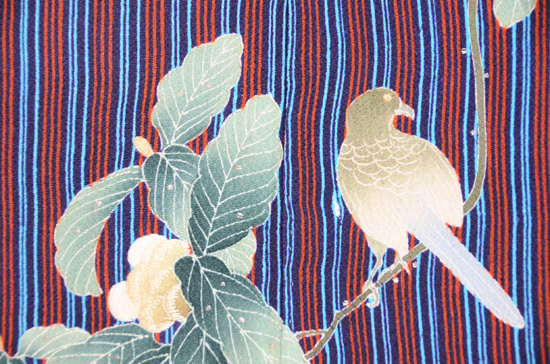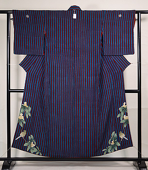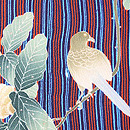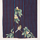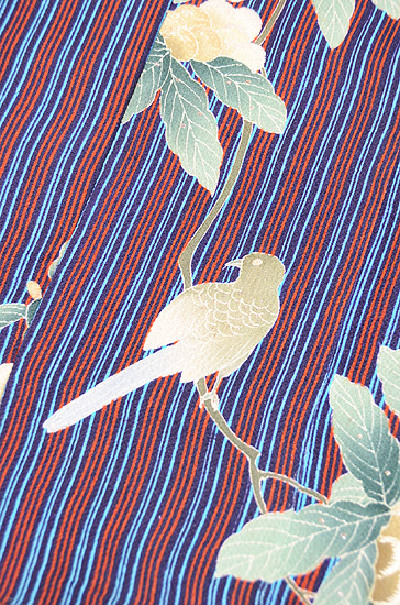 しっかりと強いタッチの縞柄とは逆に、ビワの木に様子を伺う小鳥が優しく描かれていて、 個性に溢れたお着物です。 シボの立った縮緬に、桔梗の染め3つ紋がありますので、かつては準礼装だったのでしょうが、今ではうちにお見えになるお客さまは、その様相でいらっしゃいます。