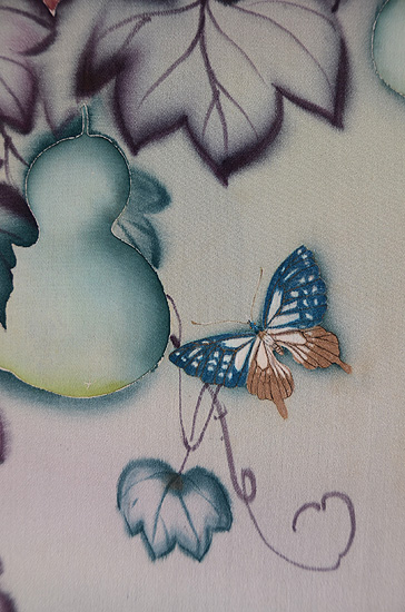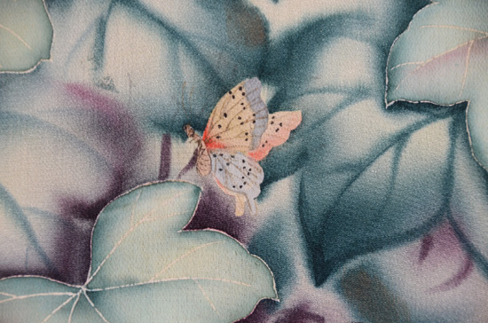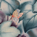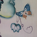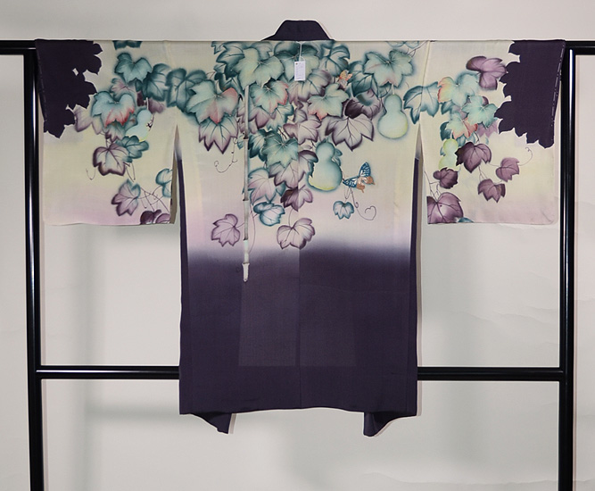 美しい蔦に覆われて、瓢と蝶々がちょっと幻想的な雰囲気のお羽織です。 袖口の濃鼠色は無双羽織の袖口布の名残ですが、表に出ておもしろいデザインとなりました。 錦紗の感触の、すばらしい着心地をお楽しみください。