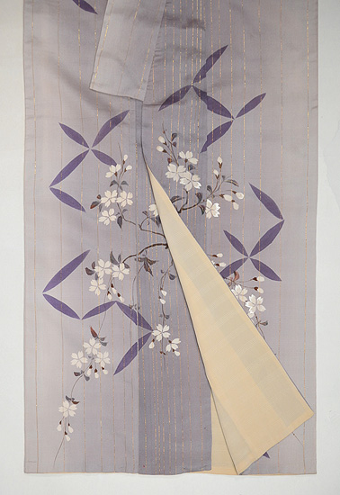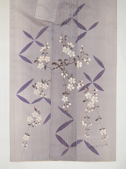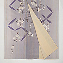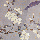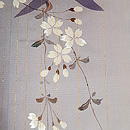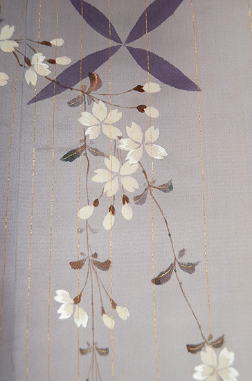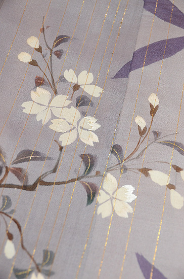 白抜きに紫の濃淡で柄付けをした、静かでシンプルな付下です。 細い金線が、滝縞のように走っているのが、アクセントになっています。