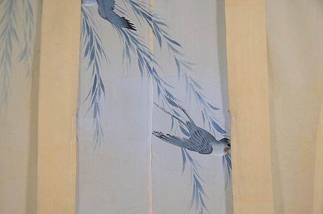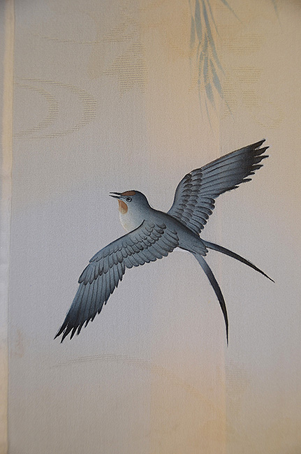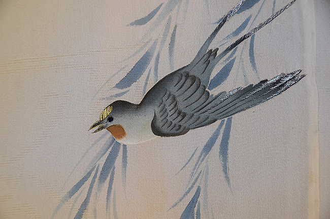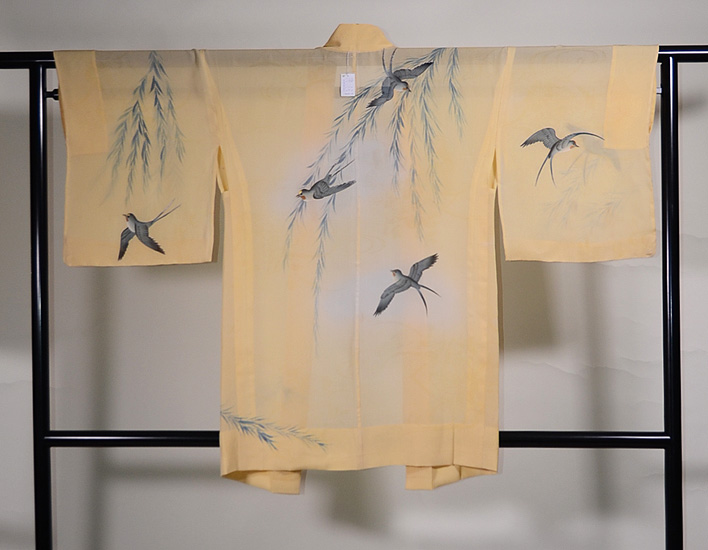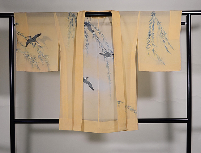 明るいく透けた紋錦紗の上を初夏の風にのって柳が揺れ、燕が遊ぶ単衣羽織です。 季節を呼ぶ素敵な羽織です。