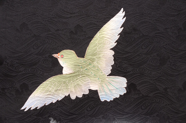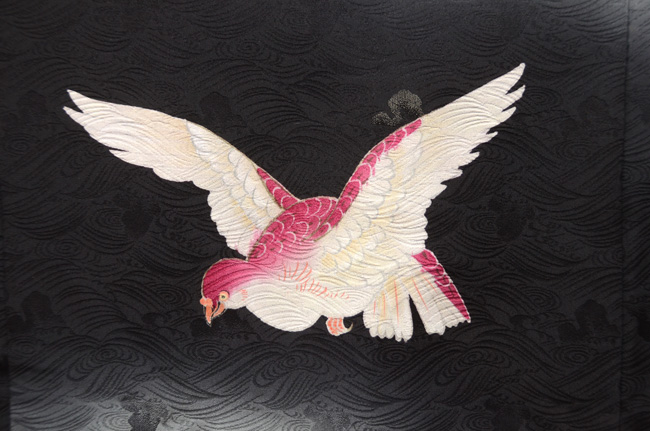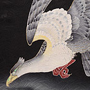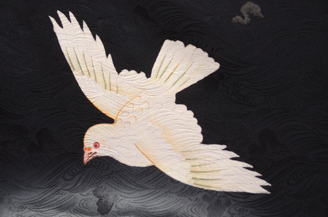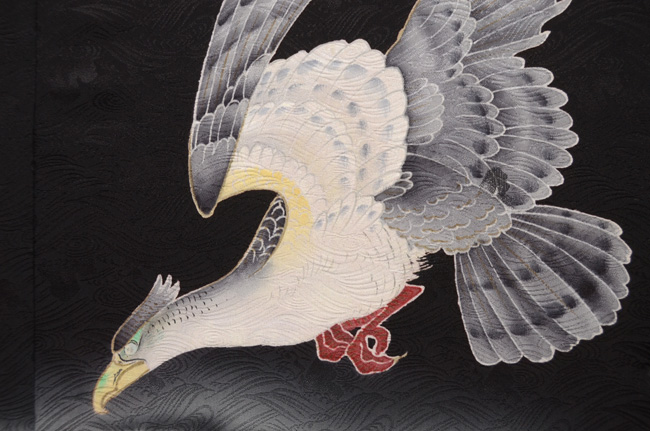 天空を舞うワシと鳩。 ワシが鋭い目をして鳩を追いかけていますが、元気な鳩たちは、きっと逃げ延びることができます。 光琳波の地紋が輝いて見えます。