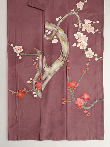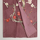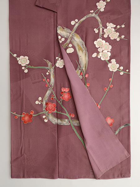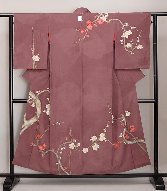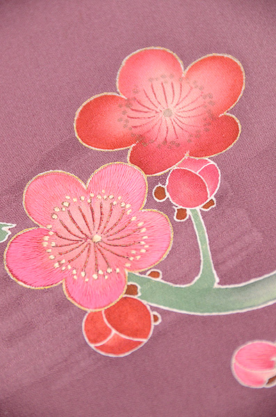 小豆色の上に、梅の枝がのびやかに描かれています。 所々に刺された刺繍が、艶やかにアクセントになっています。 上品にまとまったお色が、穏やかに晴れの日を祝ってくれています。 寸法も伸びやかです。
