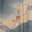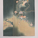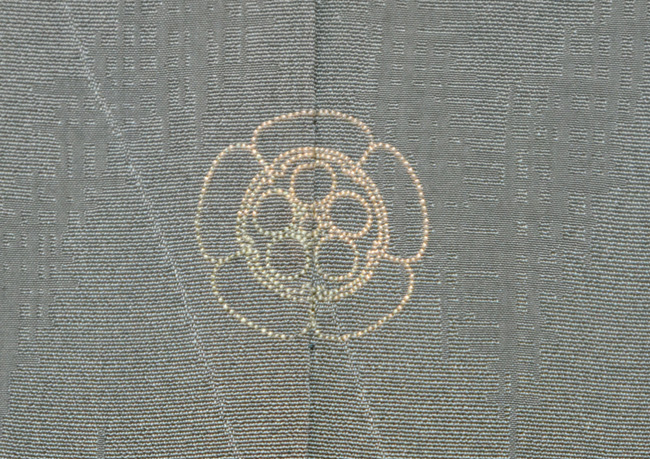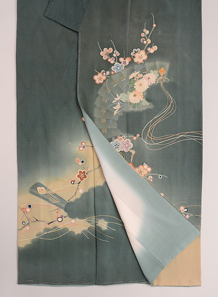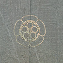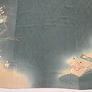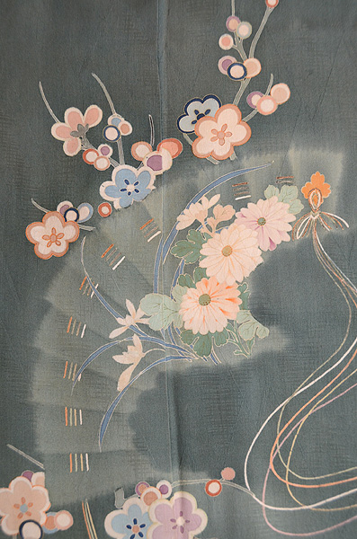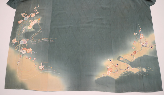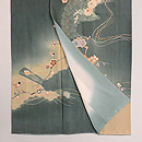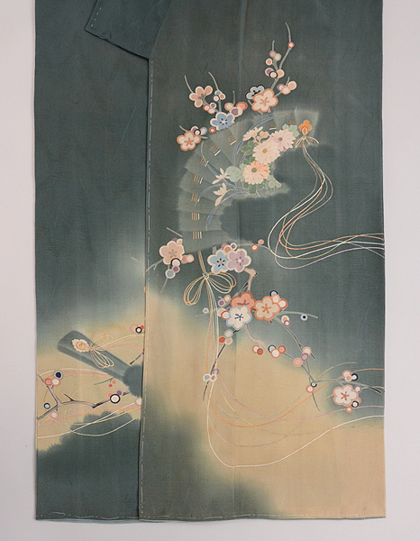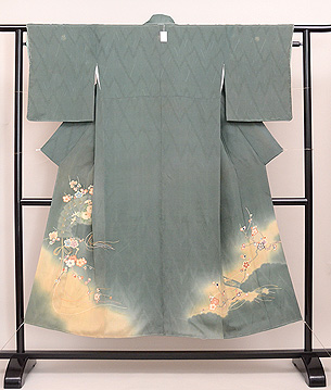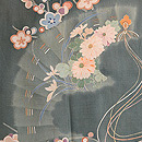 落ち着いたウグイス色に、清楚で可憐なお花が映える着物です。 檜扇の飾り紐が優雅にたなびいて、山並みの地紋が入った紋錦紗が優しい風合いを見せています。