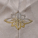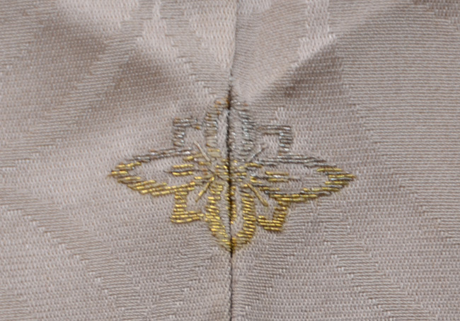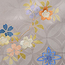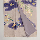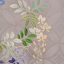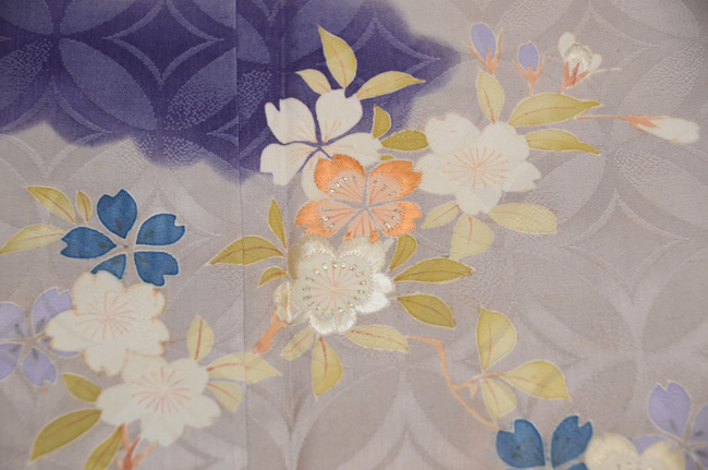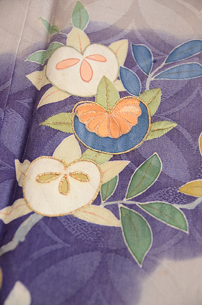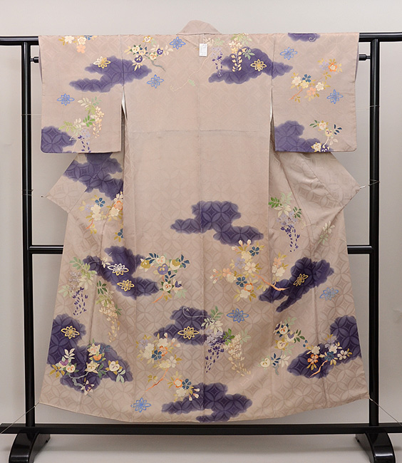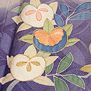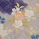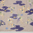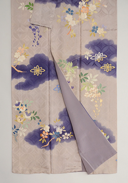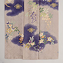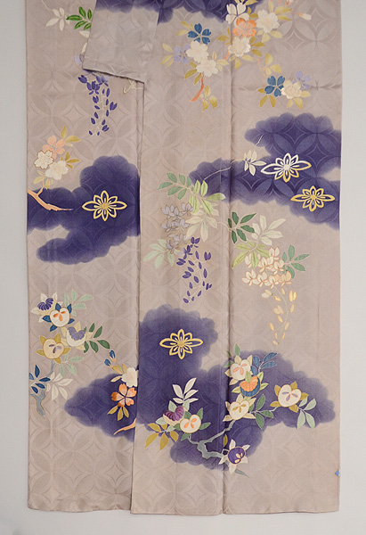 紋意匠と言われる地紋が浮き出た豪華な織物で、七宝繋ぎ文がみごとな、昭和後期の訪問着です。 橘と藤、桜が刺繍を伴って、随所に、優雅に配されています。 紫紺の雲文が全体を引き締めて風格を上げています。