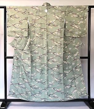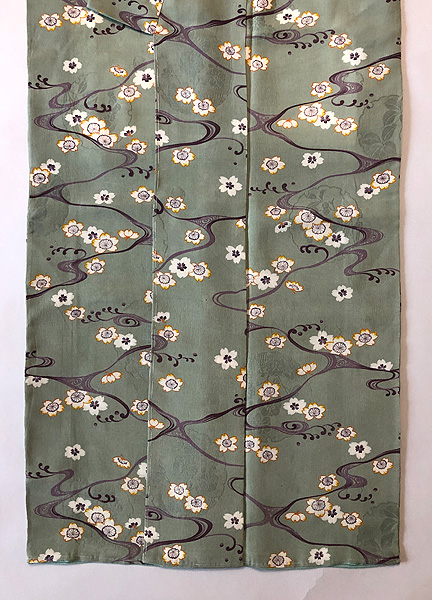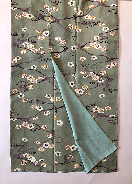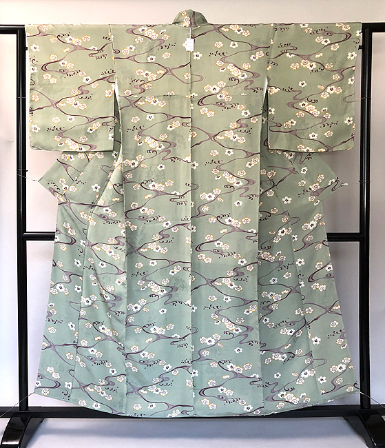 青磁色の丈いっぱいに、水の流れがサラサラと聞こえてきそうな清らかさ溢れる、凛とした小紋です。 白い帯をした立ち姿が、美しく想像できます。 たっぷりサイズにお仕立てしてあります。