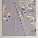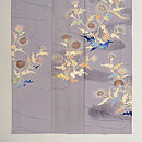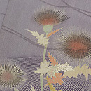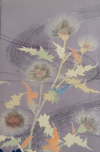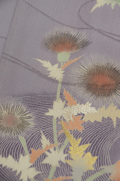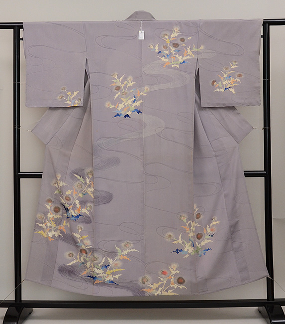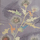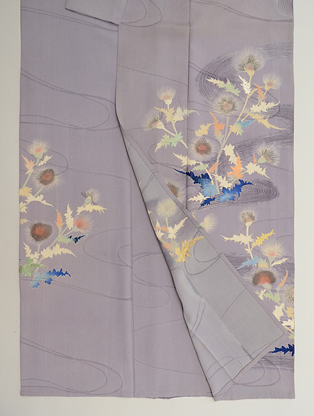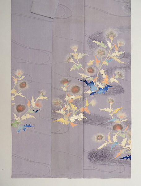 勢いよく流れてくる水辺に山アザミが、しっかりと咲いています。 花は、銀泥で葉には、華やかなお着物にふさわしく、手の込んだ多色の刺繍が、されています。 やさしい色に明るい咲いたアザミの素敵な訪問着です。