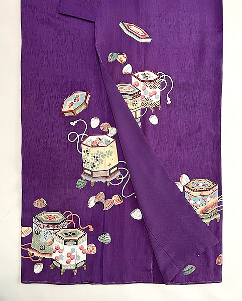 貝桶や、中に入れるたくさんの貝にも、丁寧な絵付けがされて、楽しい裾模様になっています。 綸子の地紋の光琳水が、着物に流れるような美しさを与えています。 大きな桐の3つ紋があります。