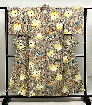 秋色の絵の具を垂らしたような空気感の中で、秋の七草でもある桔梗の花が、心地良さげに浮遊しているような小紋です。 何か幻想的にも見えて、ロマンティックな趣も見える大人かわいい小紋でもあります。