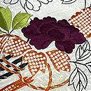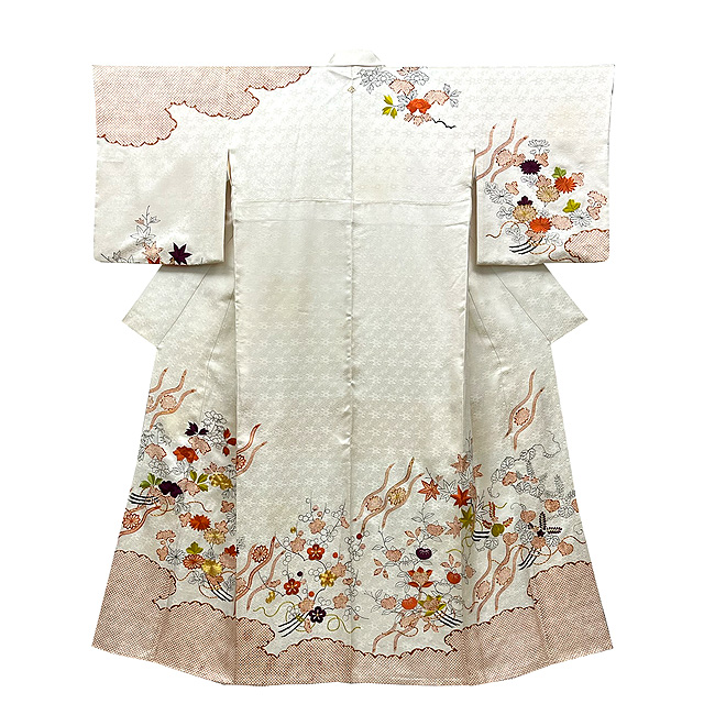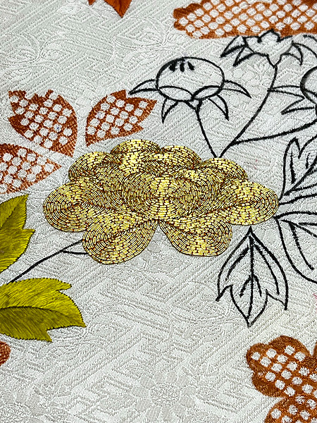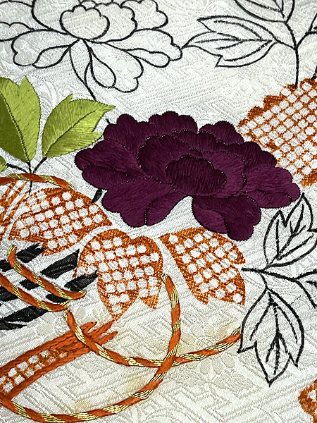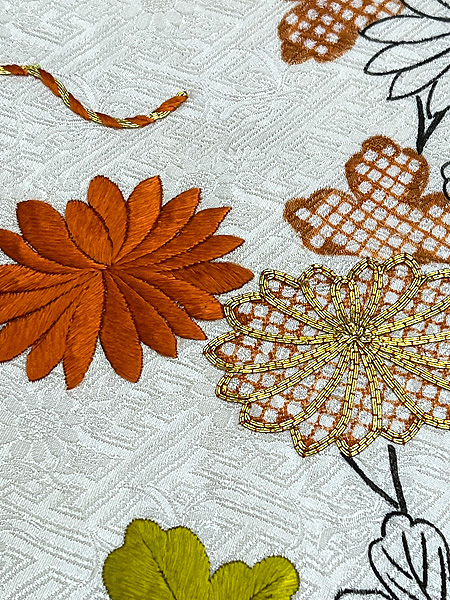 肩に疋田で雲文、胸と袖には菊と梅、牡丹の折枝文様がしなやかに刺繍されています。