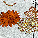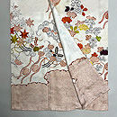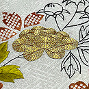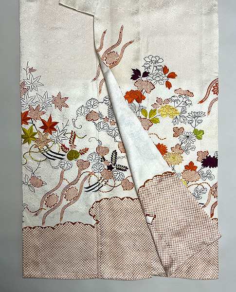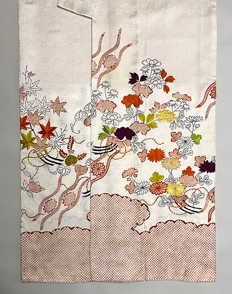 菊紗綾形の綸子地に元禄小袖の文様が描き出されています。