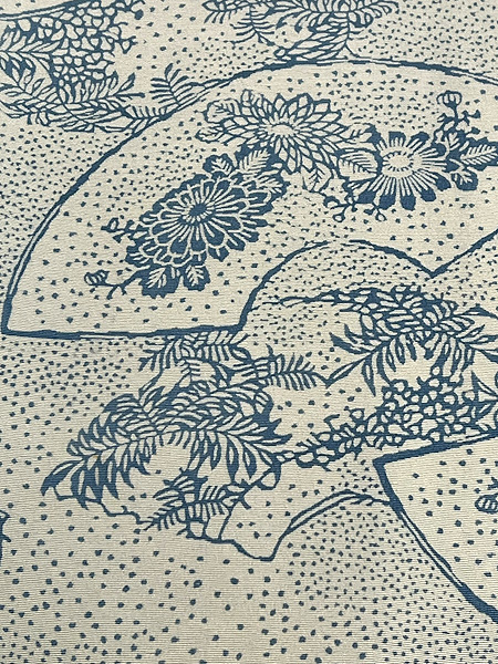 美しい白地に何枚もの型紙で染められた中形。 高度な技術をもつ松原工房のものと思われます。 白地に扇面がリズミカルに配され、菊と藤が青一色で染められ美しい景色となっています。