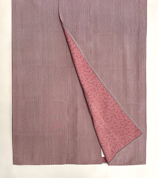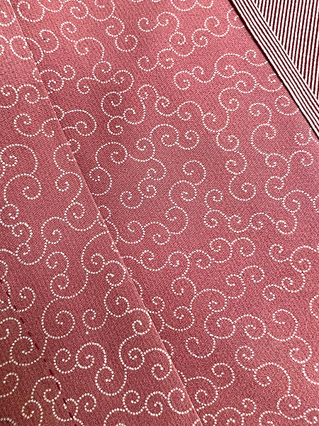 やさしいピンクの両面染めで、裏は共濃の唐草文です。 色にも柄にも品性が漂って、初夏のお出かけ時にふさわしい着物です。