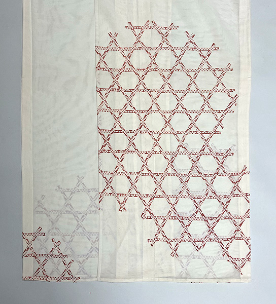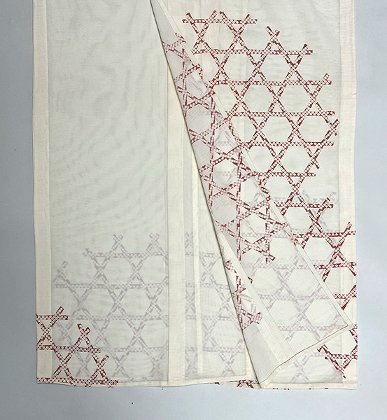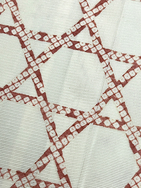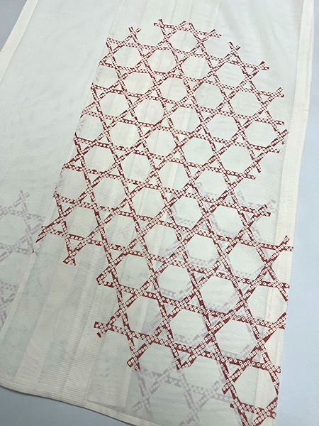 疋田模様で蛇籠が大きく表現されています。 穏やかで、しかも大胆な文様です。オシャレ心が忍んでいませんか。 素敵な帯をさがしてあげたいです。