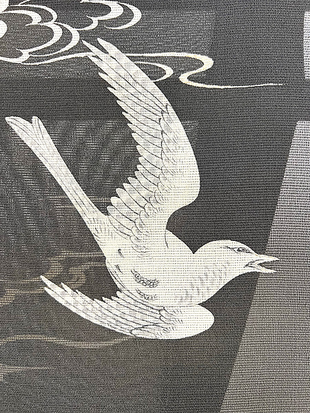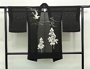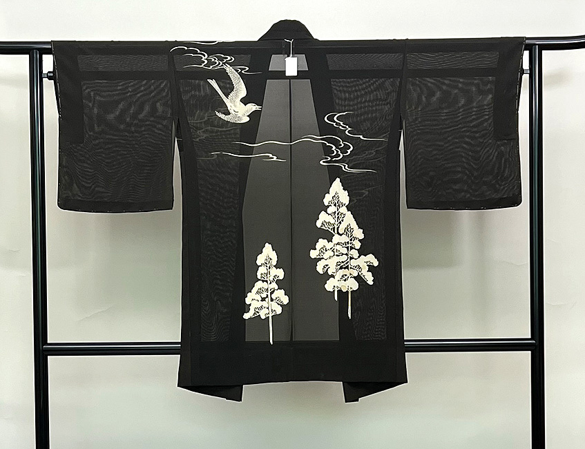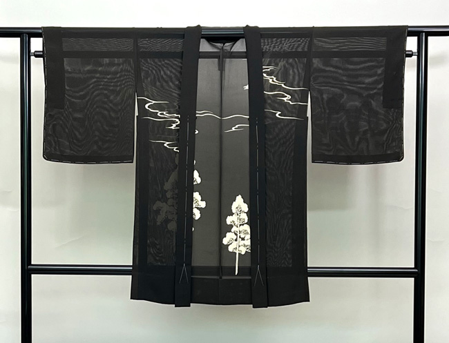 黒地に白あがりの友禅ですが、黒地が羊羹色になって、柔らかな羽織り物となっています。 お仕立て直しで、丈は出ましたが、裄はいっぱいです。