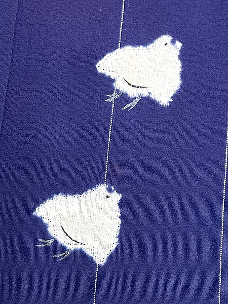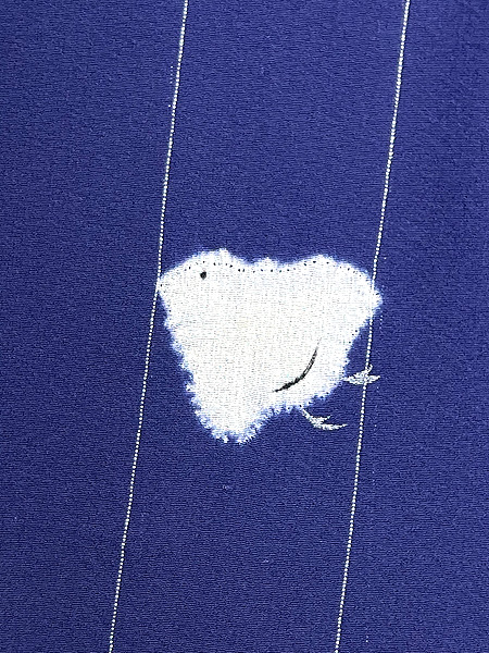 白い千鳥が自在に飛び交った楽しい単衣です。 1本の銀色の織り縞が程良い緊張感を作ってくれます。 少し色やけがあります。