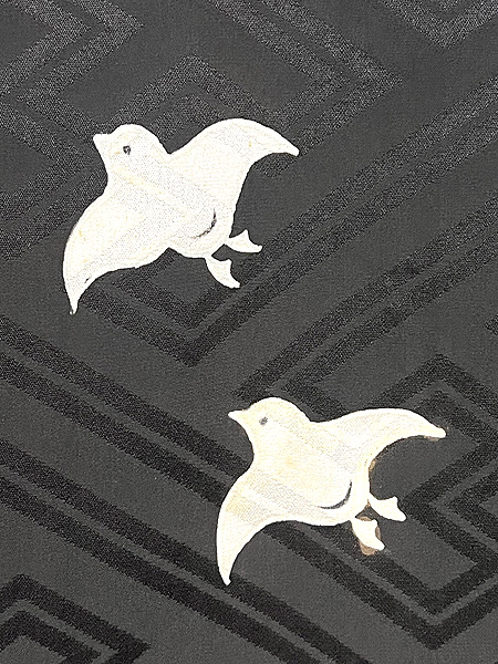 大波の勢いあるしぶきに飛ぶ千鳥の図。 白い波と千鳥が、黒地にいきいきと映える絵羽模様。 紗綾形の地紋様が、しっかりとした品格を感じさせてくれます。