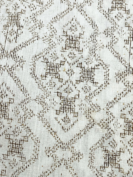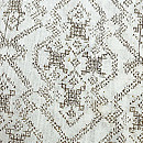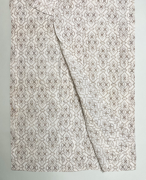 雪晒しに繊細な茶の絣が、涼を誘う美しい古代越後上布。 重なる菱文と六角絣の中に小さな十字と角で緻密な絣が、織られた希少な夏衣です。 身丈、裄共にいっぱいにお仕立直しました。
