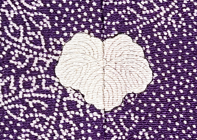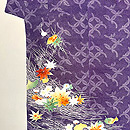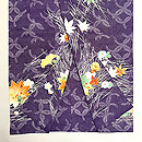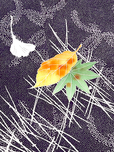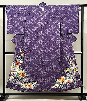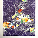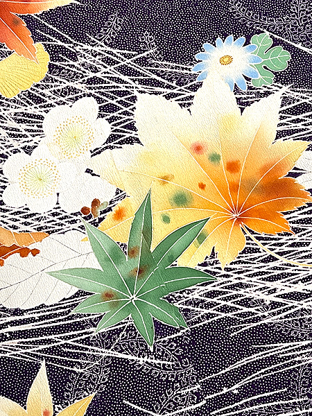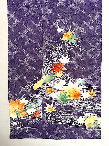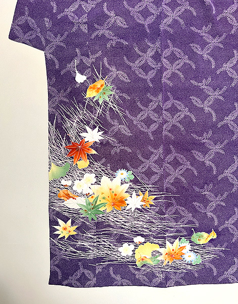 紫の藤七宝文に、吹き寄せの花や葉っぱの色が、秋の日差しに照り映えるような美しい着物です。