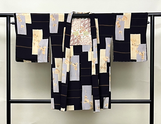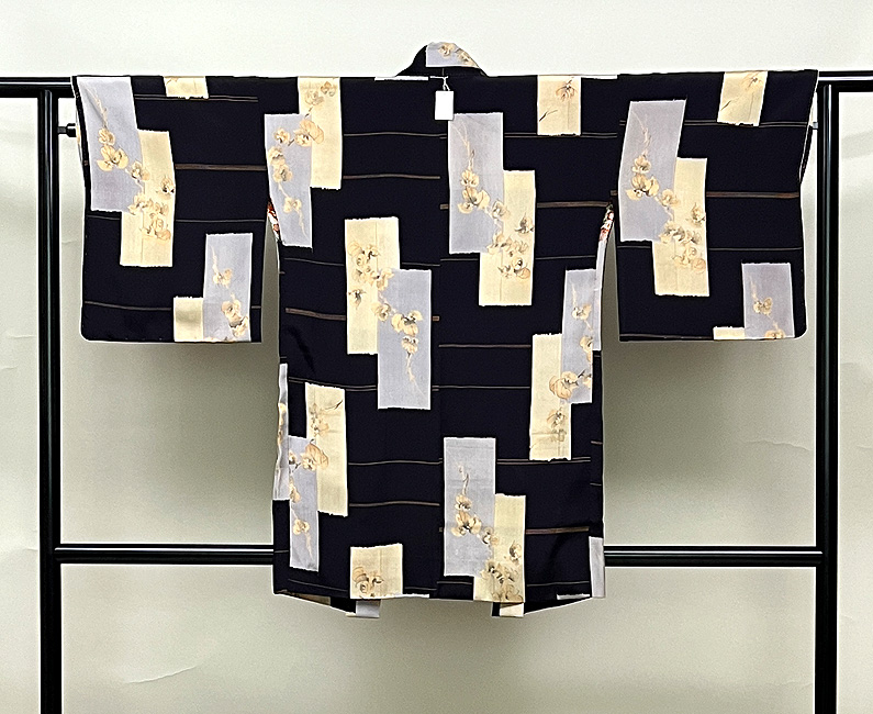 短冊に蔦文の黒地羽織 着物23-12-16 ご売約済 身丈:2尺5寸(約95cm) 裄:1尺7寸5分(約66.5cm) 袖丈:1尺3寸(約49.4cm) 袖巾:8寸7分(約33.1cm)
