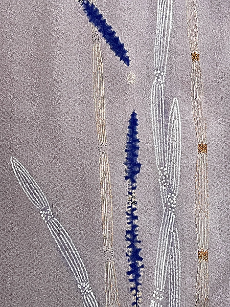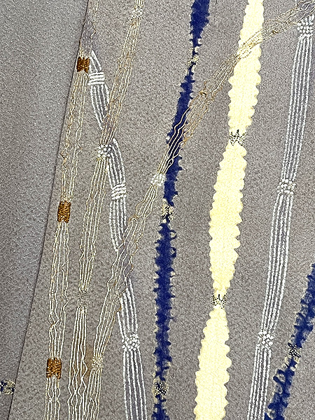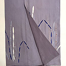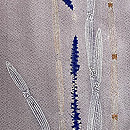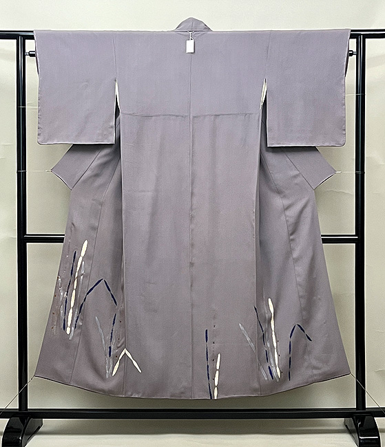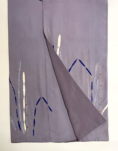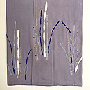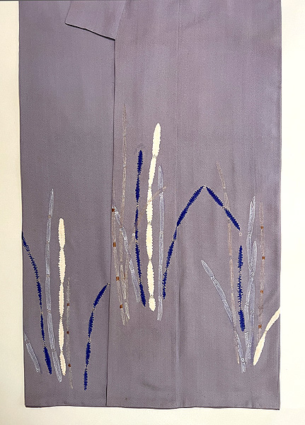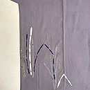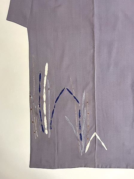 豆ガラ茶と言われる鼠色の縮緬の裾に、木賊が並んでいます。 絞りに銀泥の手描きと刺繍と、飽きのこない巧者の手法で勢い良く描ききっています。