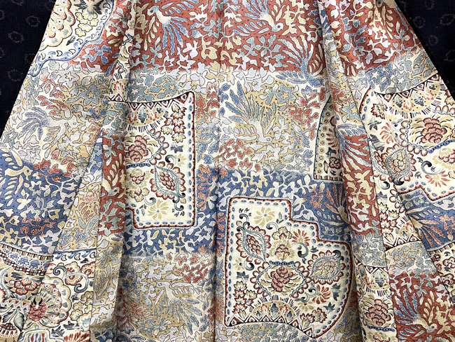 丸の中に赤い色がチラッとみえて、更紗柄の裏地と合わせ、かわいいコートができました。 暖かい冬に間に合わせていただけます。