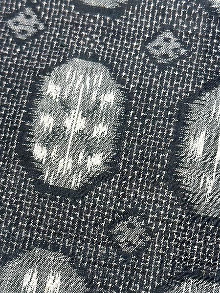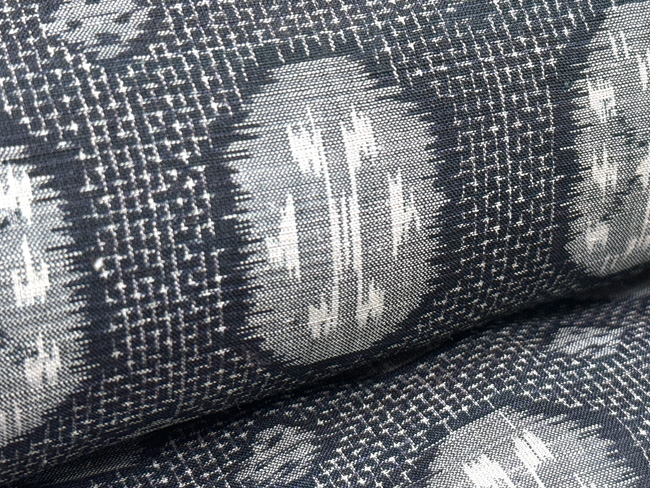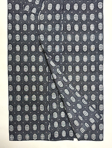 十字絣の中に八角文が並んで、中に銭文のような白絣が織り込まれています。 藍の濃淡と白糸で構成された、深みのある色味が個性的な上布です。