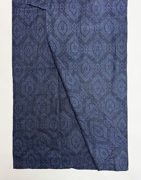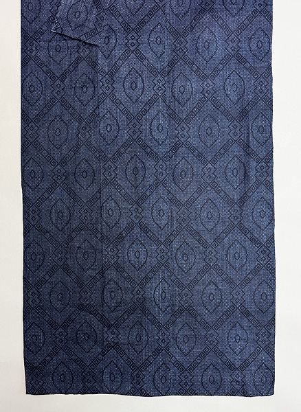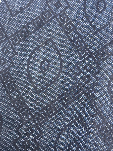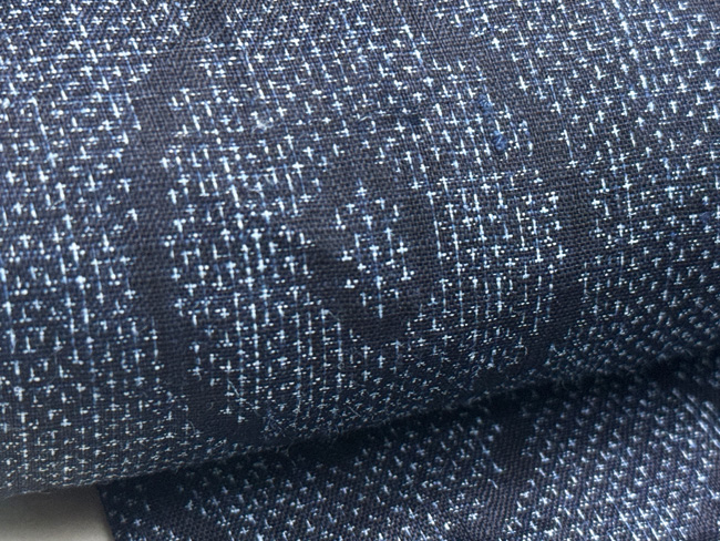 十字絣の中に雷紋で松川菱が織り出されています。 中にこれも菱形でお花のようなものがみえます。 キッチリと格調高く、宮古上布ここに、という風格までもが見えてきます。 しゃっきりとしなやかな風合いが爽やかです。