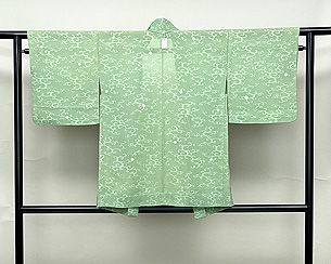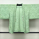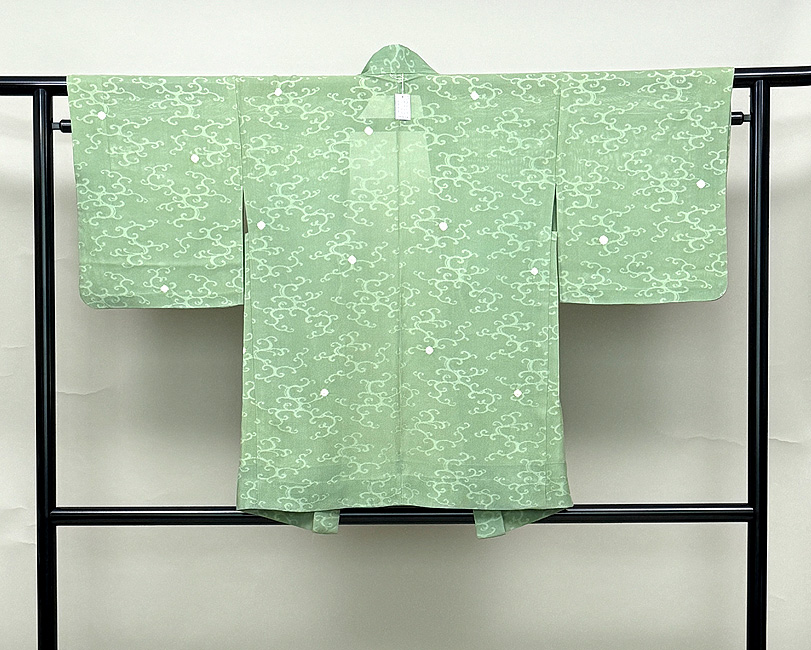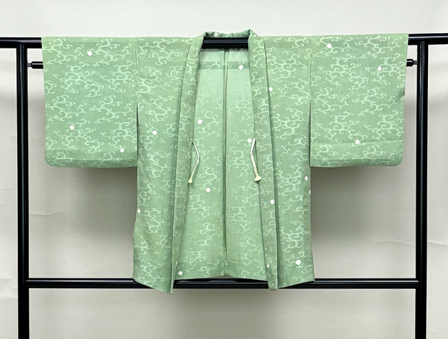 明るい草色の単衣羽織です。 白い水玉が絞りで入って清涼感を出しています。