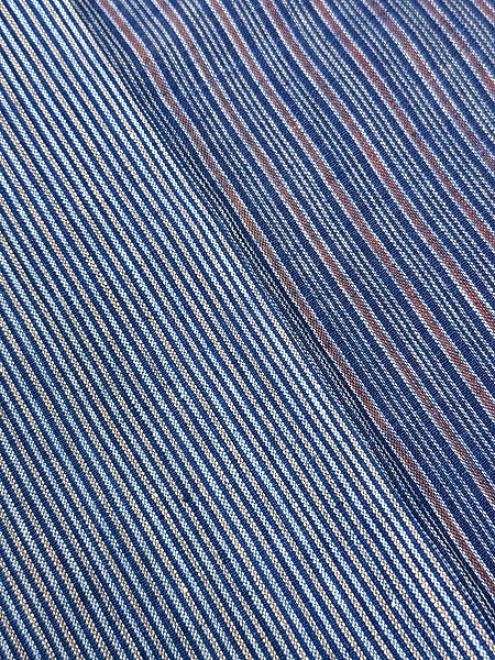 左身頃は薄い藍色とベージュの棒縞、右身頃は藍色と臙脂色の変わり両子持縞になっています。