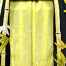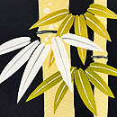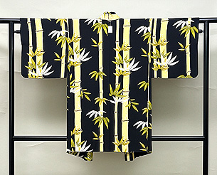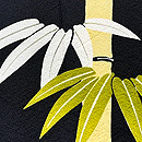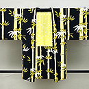 黒の縮緬地に大胆な竹の文様をほどこした羽織。 ところどころに水のしずくをたたえた黄肌色の幹に、白から草色へのグラデーションで描かれた葉が生き生きと描かれ、生命力を感じます。 袖丈、裄出しが可能です。