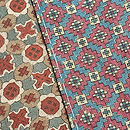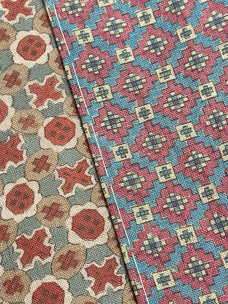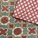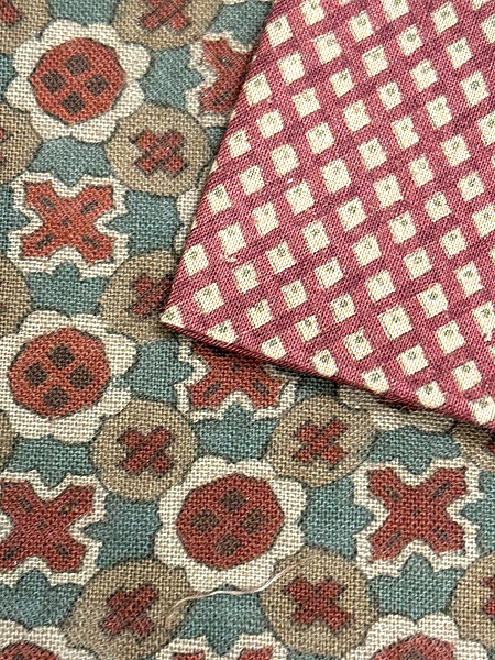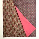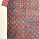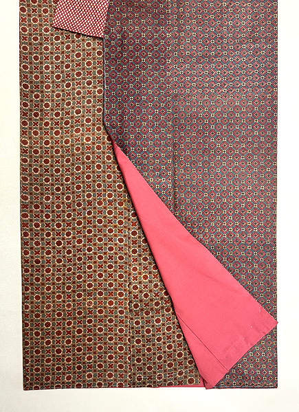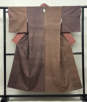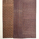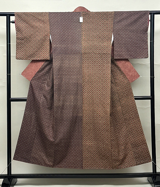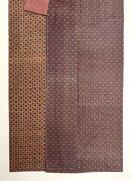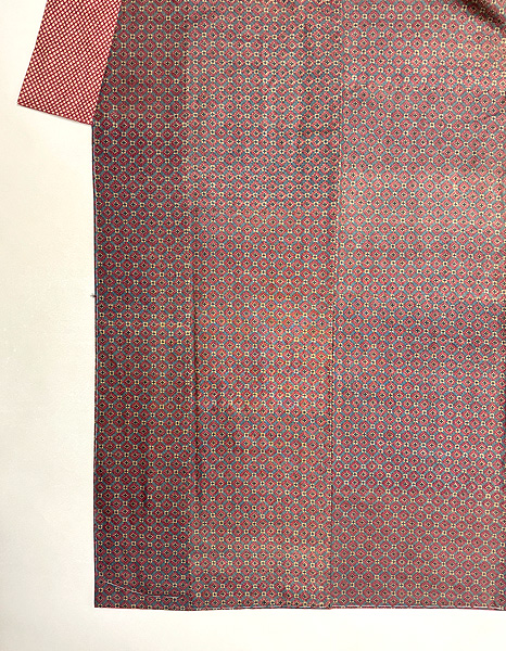 茜色と灰青色を基調にした2種類の大正更紗の生地を片身替わりに仕立て、細かい目入りの菱紋様を衿にあしらいました。 男性用の襦袢として使われていた生地で作った、粋な着物です。